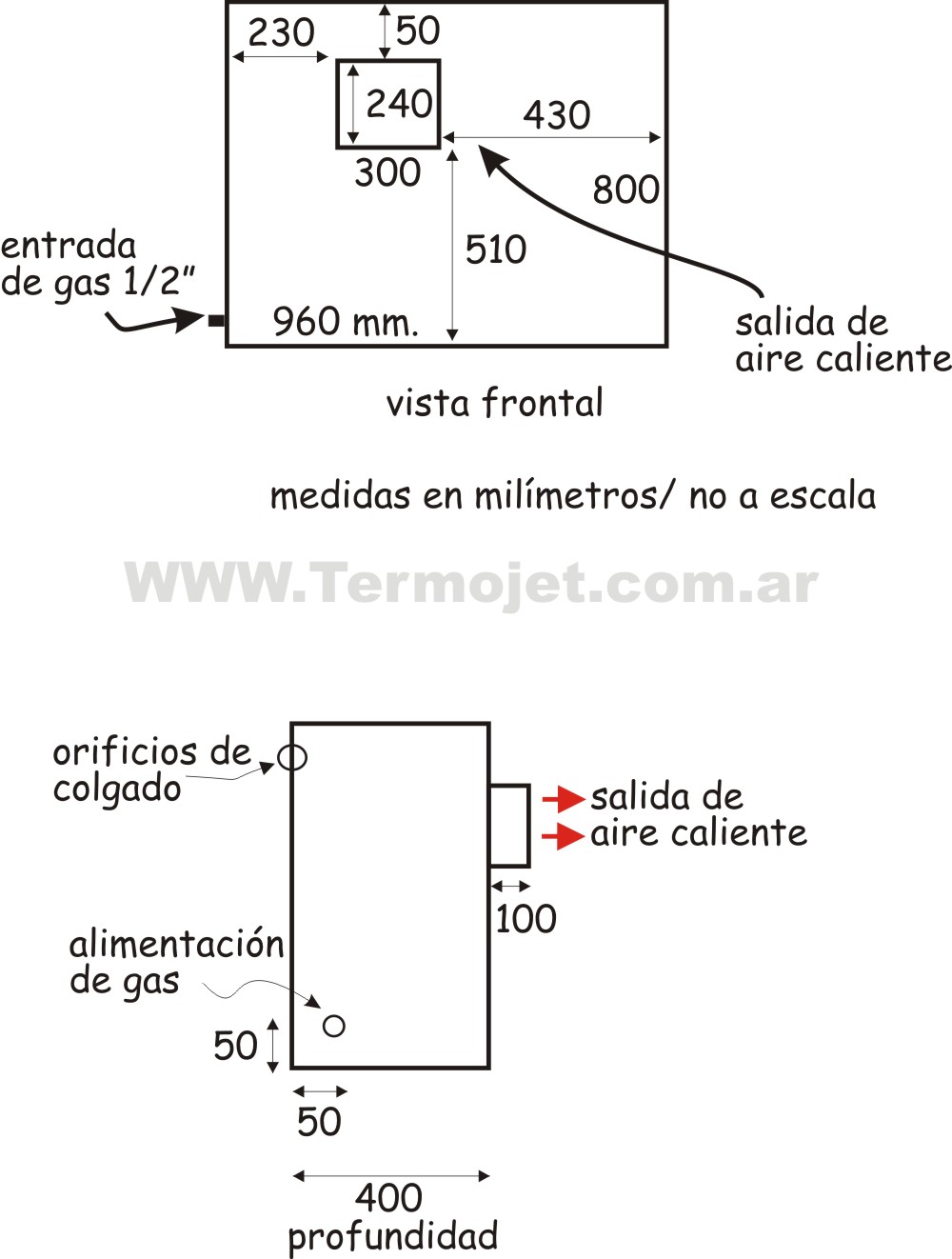 Especificaciones Combustión modulada en camara interna automatica. Simple instalación. La unidad esta resuelta con la filosofia de un electrodomestico, se conecta y funciona en minutos. Sin complicaciones ni albañileria. Va colgado de la pared a 2 m.de altura, permitiendo la actividad normal y circulación por debajo de la unidad. El termostato comanda el funcionamiento en forma automática. Potencia modulable on demand con un pico máximo de 65.000 Kilocalorías. Bajo consumo promedio: menor a 3.2 m3/h Caudales de aire caliente
